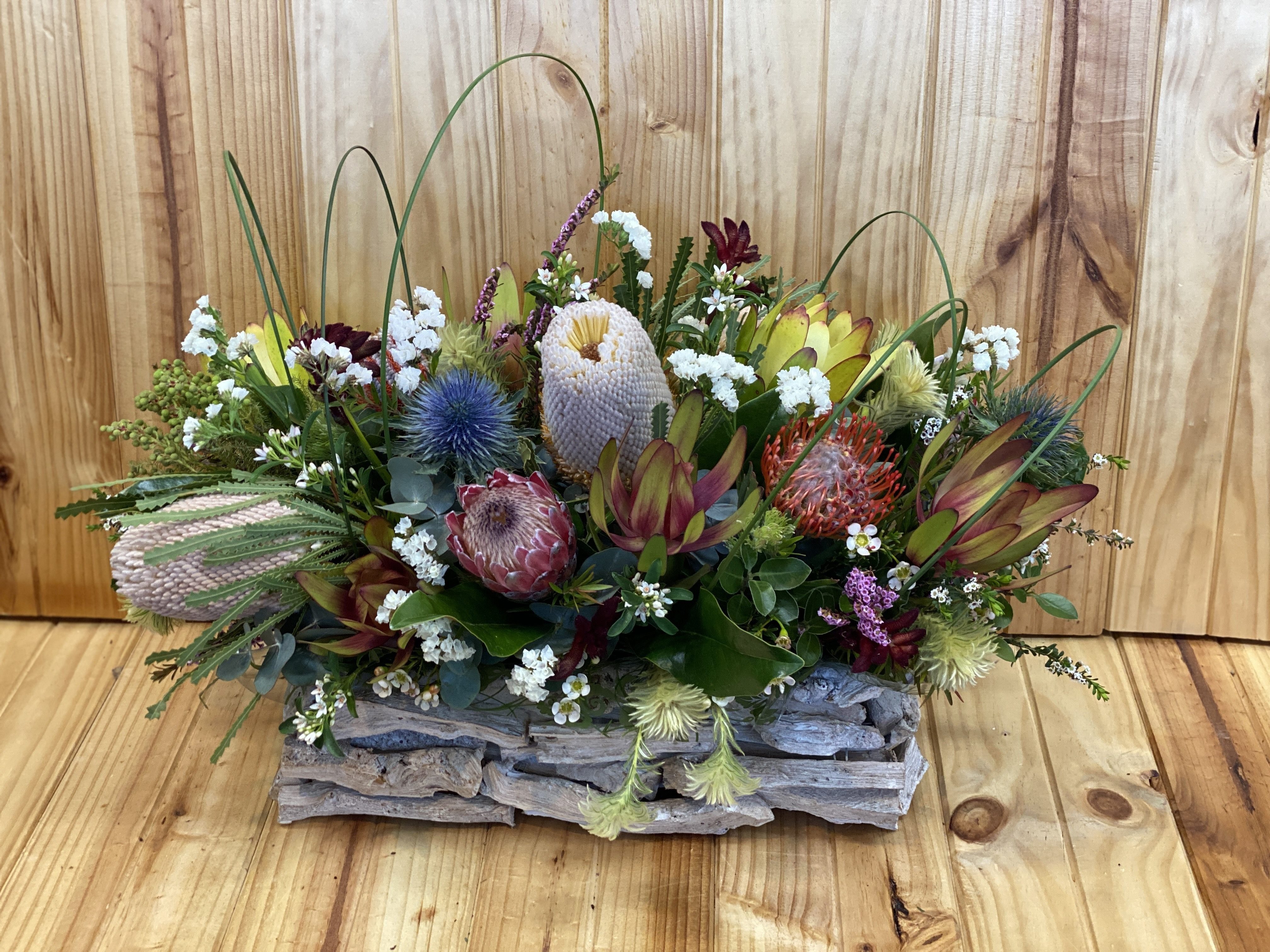 A Modern arrangement featuring a mix of native flowers. Perfect for office or table centrepiece.